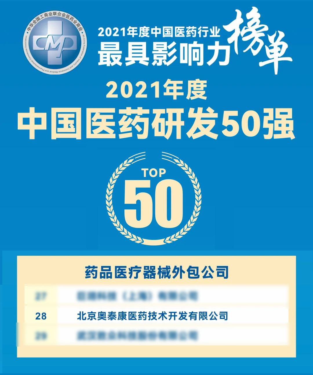 12月8日,全國工商聯(lián)醫(yī)藥業(yè)商會發(fā)布2021年度中國醫(yī)藥行業(yè)最具影響力榜單,經(jīng)過專家組成員評選,奧泰康入圍2021年度中國醫(yī)藥研發(fā)50強榜單。