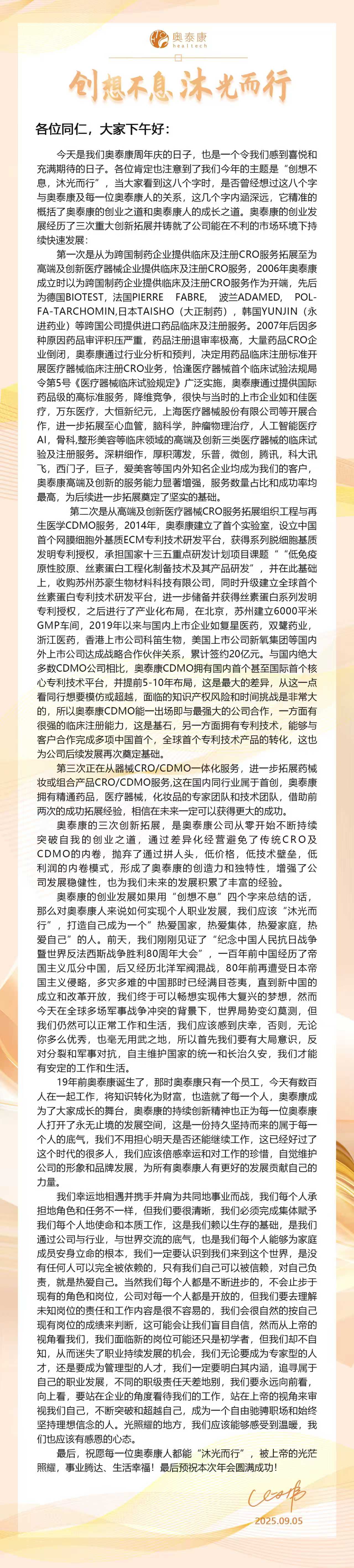 饒義偉先生講到,在這個喜悅而充滿期待的奧泰康周年慶之日,我們以“創(chuàng)想不息,沐光而行”為主題,回顧過去、展望未來。奧泰康的創(chuàng)業(yè)歷程經(jīng)歷了三次關(guān)鍵創(chuàng)新拓展:從為跨國藥企提供藥品CRO服務(wù),拓展高端及創(chuàng)新醫(yī)療器械臨床與注冊CRO服務(wù),以國際標(biāo)準(zhǔn)降維競爭,服務(wù)眾多知名企業(yè);進(jìn)而拓展組織工程與再生醫(yī)學(xué)研發(fā)及生產(chǎn)CDMO服務(wù),憑借核心專利技術(shù)和前瞻布局,與國內(nèi)外上市公司達(dá)成戰(zhàn)略合作;如今正進(jìn)一步拓展藥械妝或組合產(chǎn)品的CRO/CDMO一體化服務(wù),開創(chuàng)行業(yè)先河。這些突破避免了同質(zhì)化競爭,奠定了奧泰康獨特的創(chuàng)造力和穩(wěn)健的發(fā)展基礎(chǔ)。