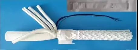 一體化免縫合帶支架人工血管系統(tǒng)包括人工血管和免縫合扣帶兩部分,通過主動(dòng)脈覆膜支架進(jìn)行腔內(nèi)修復(fù),一般由股動(dòng)脈導(dǎo)入,到達(dá)病變部位后釋放支架,支架撐開后固定在主動(dòng)脈內(nèi)壁,將病變血管覆蓋,重建安全通路,恢復(fù)血流循環(huán)。