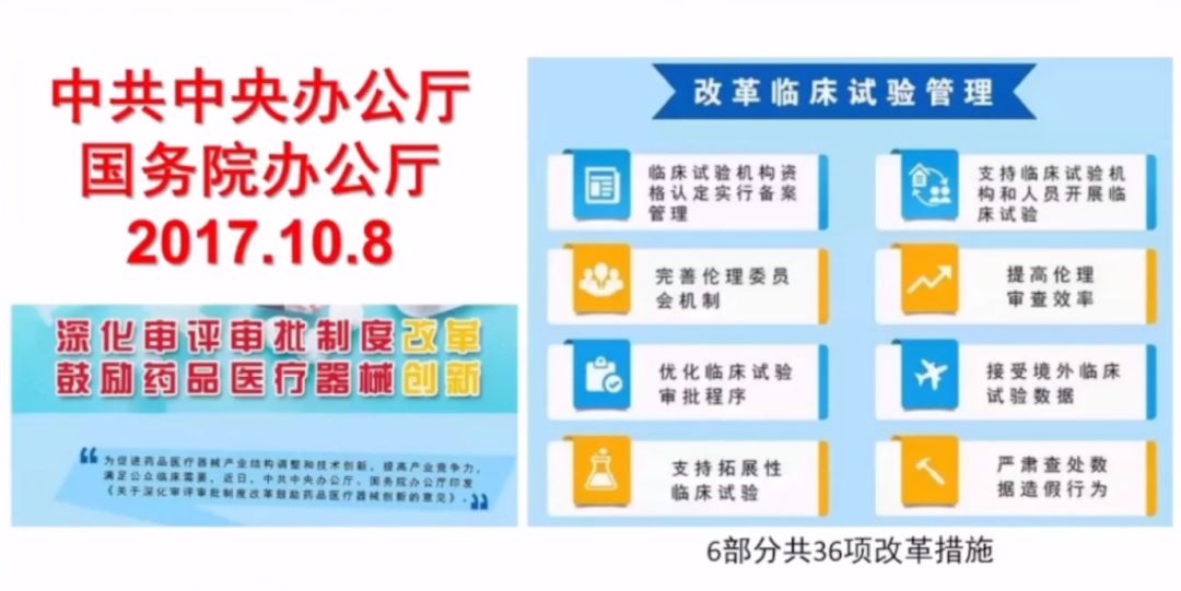 2017年10月8日,為鼓勵藥品醫(yī)療器械科技創(chuàng)新,提高上市產(chǎn)品質(zhì)量和產(chǎn)業(yè)競爭力,滿足公眾臨床需要,中共中央辦公廳、國務(wù)院辦公廳印發(fā)了《關(guān)于深化審評審批制度改革鼓勵藥品醫(yī)療器械創(chuàng)新的意見》。在多方面深化了審批制度,包括改革臨床試驗管理、加快上市審評審批、促進藥品創(chuàng)新和仿制藥發(fā)展、加強藥品醫(yī)療器械全生命周期管理、提升技術(shù)支撐能力、加強組織實施等。