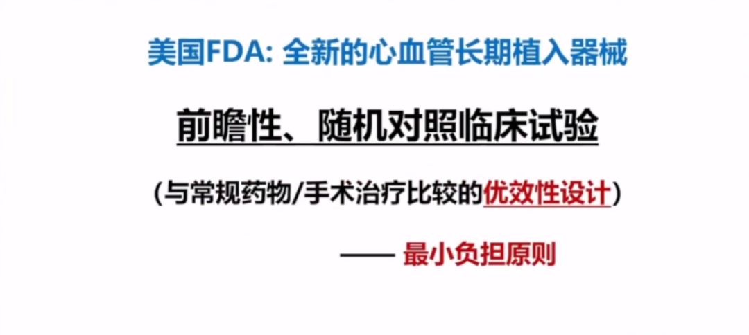 李衛(wèi)教授講到,美國FDA針對全新的心血管長期植入器械,也要做前瞻性、隨機對照臨床試驗。創(chuàng)新產(chǎn)品無同類產(chǎn)品可對照,可與常規(guī)的藥物/手術(shù)治療比較的優(yōu)效性設(shè)計,也就是最小負擔原則。