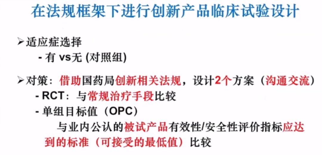 在法規(guī)框架下進行創(chuàng)新產(chǎn)品的臨床試驗設(shè)計,李教授認為最關(guān)鍵的是適應(yīng)癥的選擇問題(有無對照組),可設(shè)計出2個方案,以便和國家藥監(jiān)局相關(guān)部門溝通。