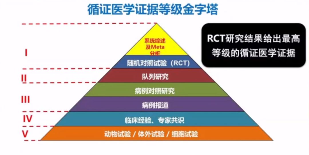 李衛(wèi)教授表示,根據(jù)循證醫(yī)學證據(jù)級別金字塔中最高等級的I級證據(jù)顯示,基于良好設(shè)計的隨機對照試驗(randomized controlled trial,RCT)最能夠評價器械的安全性和有效性。