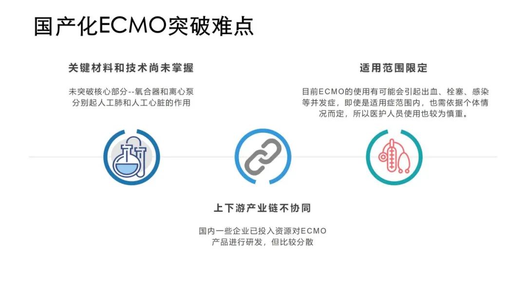 又稱“人工肺、葉克膜”,一種重要的體外生命支持技術,將患者的部分靜脈血從體內引到體外,經(jīng)膜肺氧合后再由驅動泵將血液回輸體內,對嚴重循環(huán)、呼吸衰竭的病人進行有效支持,主要用于心臟功能不全、呼吸功能不全的支持,被譽為ICU里把守“生死之門”的最后一道防線,搶救新冠肺炎危重病人的“終極武器”,ECMO作為常規(guī)治療無效的危重型新冠肺炎患者的挽救性治療設備,是《新型冠狀病毒肺炎診療方案》中明確的治療措施,但受制于研發(fā)難、生產(chǎn)難、技術門檻高、臨床使用制約等多因素限制,國產(chǎn)企業(yè)無ECMO設備獲批上市,我國ECMO嚴重依賴進口,主要被美敦力(Medtronic)、理諾琺(LivaNova)和邁維柯(Maquet)三家壟斷。