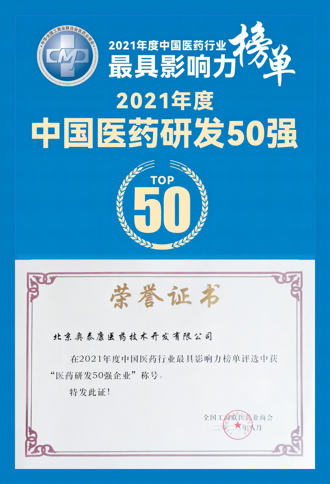2023年3月25日-27日,全國工商聯(lián)醫(yī)藥業(yè)商會年度峰會于青島隆重舉行,大會公布了“2021年度中國醫(yī)藥行業(yè)最具影響力榜單”,奧泰康在本次評選中入圍中國醫(yī)藥研發(fā)50強(qiáng)榜單。