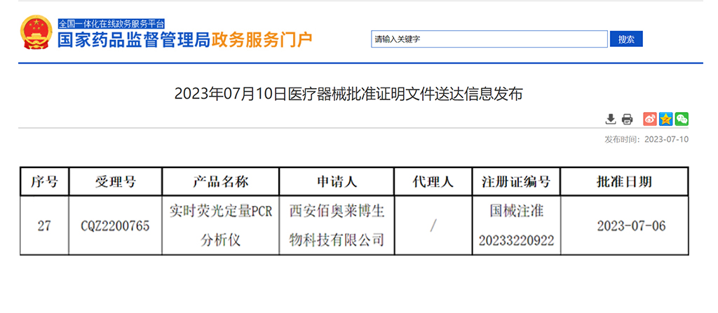 2023年7月6日,經(jīng)國家藥品監(jiān)督管理局公示,西安佰奧萊博生物科技有限公司的“實(shí)時熒光定量PCR分析儀”(國械注準(zhǔn)20233220922)獲得NMPA批準(zhǔn)上市,系2023年奧泰康助力獲得的第11張三類醫(yī)療器械注冊證。