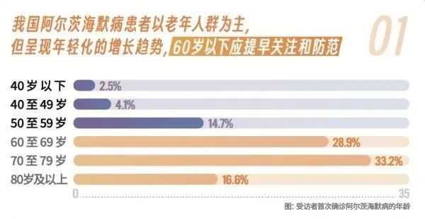 數(shù)據(jù)表明,首次確診阿爾茨海默病的人群中,年齡在60至79歲之間的人群占比最高,為62.1%。但值得注意的是,60歲以下的阿爾茨海默病發(fā)病患者在本次調(diào)查中占到了21.3%,相比國(guó)際上報(bào)道的早發(fā)型阿爾茨海默病占比5-10%更多,表明阿爾茨海默病在我國(guó)發(fā)病越來(lái)越年輕化。由于這類(lèi)罹患人群尚處工作年齡,需要引起全社會(huì)的高度重視,強(qiáng)化全人群健康教育,加強(qiáng)疾病預(yù)防、早期篩查和診斷。