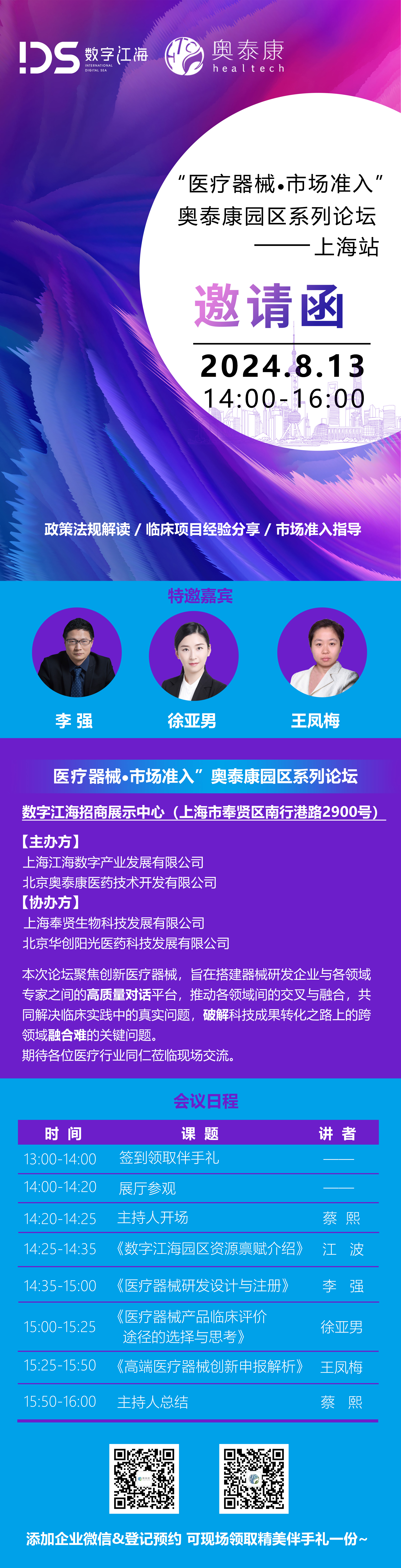 2024年8月13日(下周二),“醫(yī)療器械●市場(chǎng)準(zhǔn)入”奧泰康園區(qū)系列論壇將在上海召開(kāi),本次論壇主講嘉賓為數(shù)字江海產(chǎn)業(yè)發(fā)展事業(yè)部總監(jiān)江波、奧泰康蘇州CDMO中心負(fù)責(zé)人李強(qiáng)、臨床注冊(cè)部總監(jiān)徐亞男、項(xiàng)目運(yùn)營(yíng)中心注冊(cè)經(jīng)理王鳳梅,聚焦醫(yī)療器械市場(chǎng)準(zhǔn)入與大家展開(kāi)交流探討。