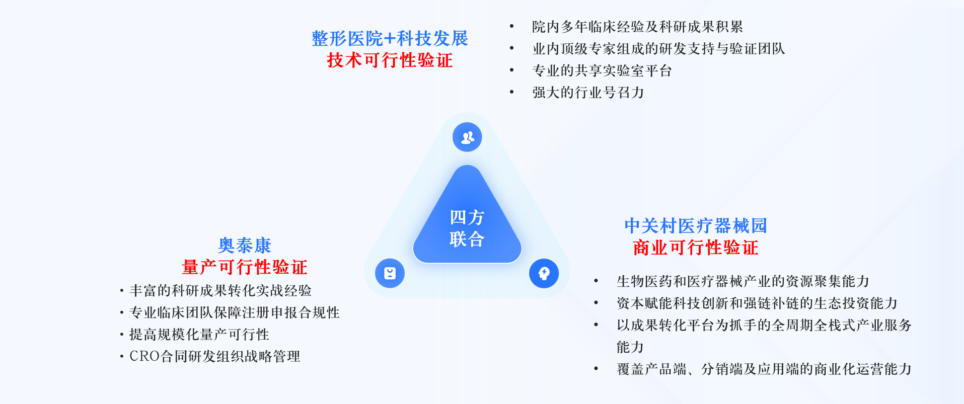 北京市整形醫(yī)學(xué)概念驗(yàn)證中心項(xiàng)目,由四家單位聯(lián)合申報(bào)實(shí)施。其中北京八大處整形科技發(fā)展有限公司聯(lián)合中國(guó)醫(yī)科院整形外科醫(yī)院完成技術(shù)可行性驗(yàn)證,北京奧泰康醫(yī)藥技術(shù)開(kāi)發(fā)有限公司負(fù)責(zé)量產(chǎn)化驗(yàn)證,中關(guān)村醫(yī)療器械園有限公司完成商業(yè)化驗(yàn)證,四方相互協(xié)同,構(gòu)建“醫(yī)研產(chǎn)銷”一體化生態(tài)。