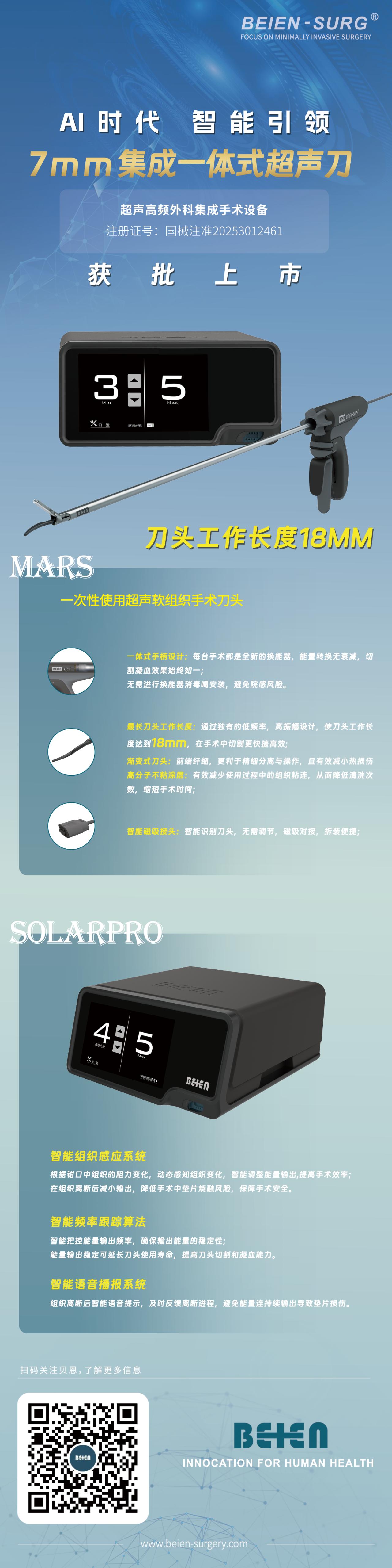 貝恩外科創(chuàng)新突破!全新7mm集成超聲刀正式獲批上市。SolarPro主機和Mars超聲刀頭在技術(shù)上進行了全面升級。它搭載了新一代智能超聲能量控制系統(tǒng)與一體式集成技術(shù),實現(xiàn)了7毫米級血管的精準(zhǔn)閉合與超低熱損傷;獨有的低頻率、高振幅設(shè)計,使刀頭有效工作長度達到18mm,達到了能量外科領(lǐng)域的最高水平。此次獲批與上市,是貝恩外科在高端微創(chuàng)器械領(lǐng)域研發(fā)實力與產(chǎn)品創(chuàng)新能力的集中展現(xiàn),為公司的產(chǎn)品矩陣與市場發(fā)展注入了新的核心動能。