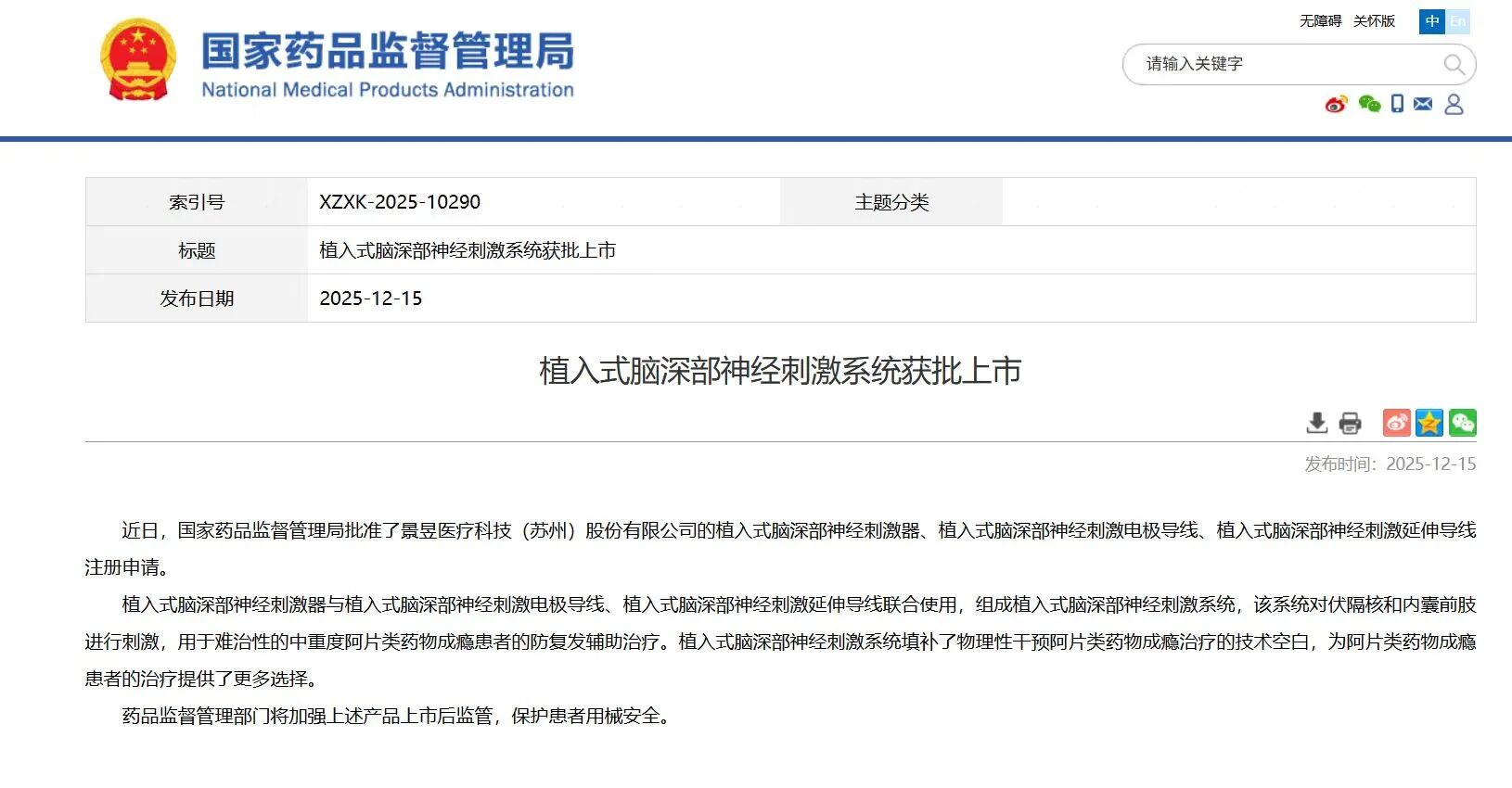 2025年12月15日,經(jīng)國家藥品監(jiān)督管理局公示,景昱醫(yī)療科技(蘇州)股份有限公司的植入式腦深部神經(jīng)刺激器(國械注準20253122580)及植入式腦深部神經(jīng)刺激延伸導(dǎo)線產(chǎn)品獲得NMPA批準上市,奧泰康提供MA解決方案。