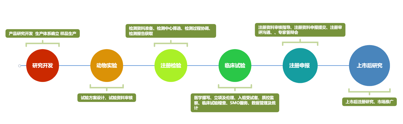 研究開發(fā)—動物實(shí)驗(yàn)—注冊檢驗(yàn)—臨床試驗(yàn)—注冊申報—上市后研究